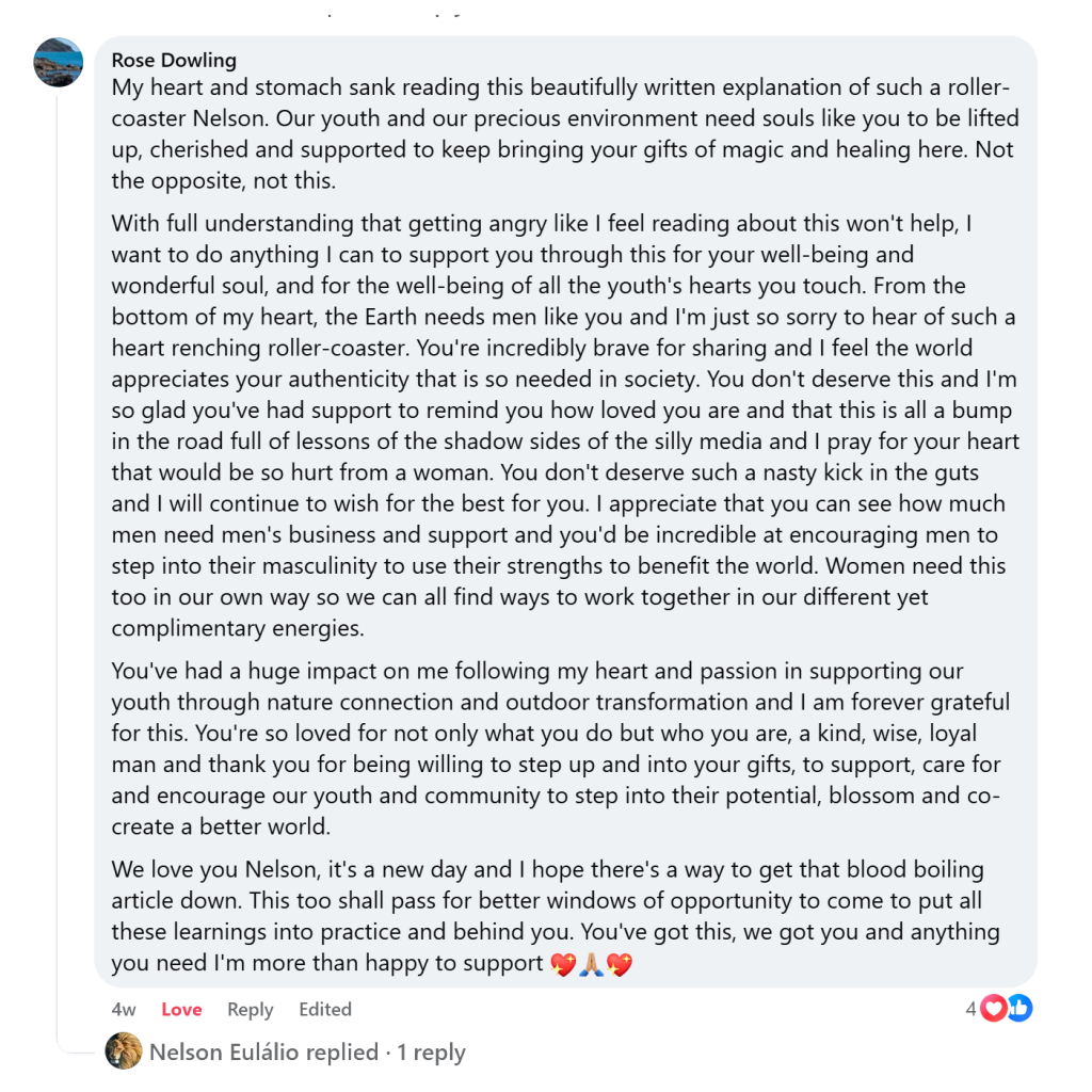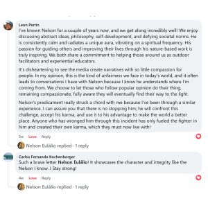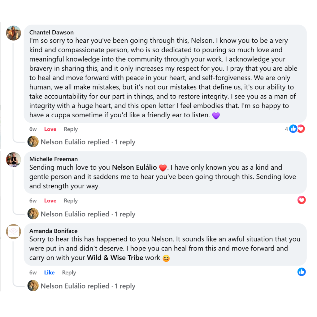 This is Nelson Eulalio, founder of the Wild and Wise Tribe, and I am writing this open letter to share something that has happened in my personal life in the last two months which has also impacted my professional life, and to advise of a situation where my confidentiality has been breached by a news article, as well as by how my ex-girlfriend has portrayed my character publicly.